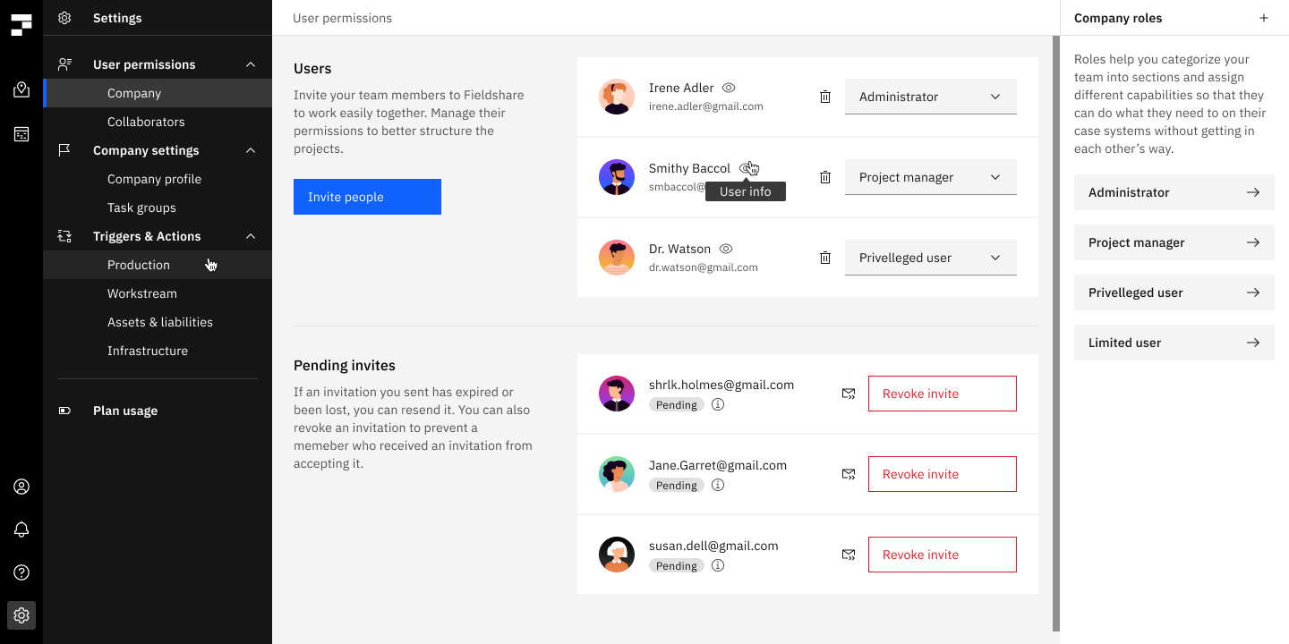 Invite team members to a project or a group of projects, and control who sees what with Fieldshare’s granular permission settings.